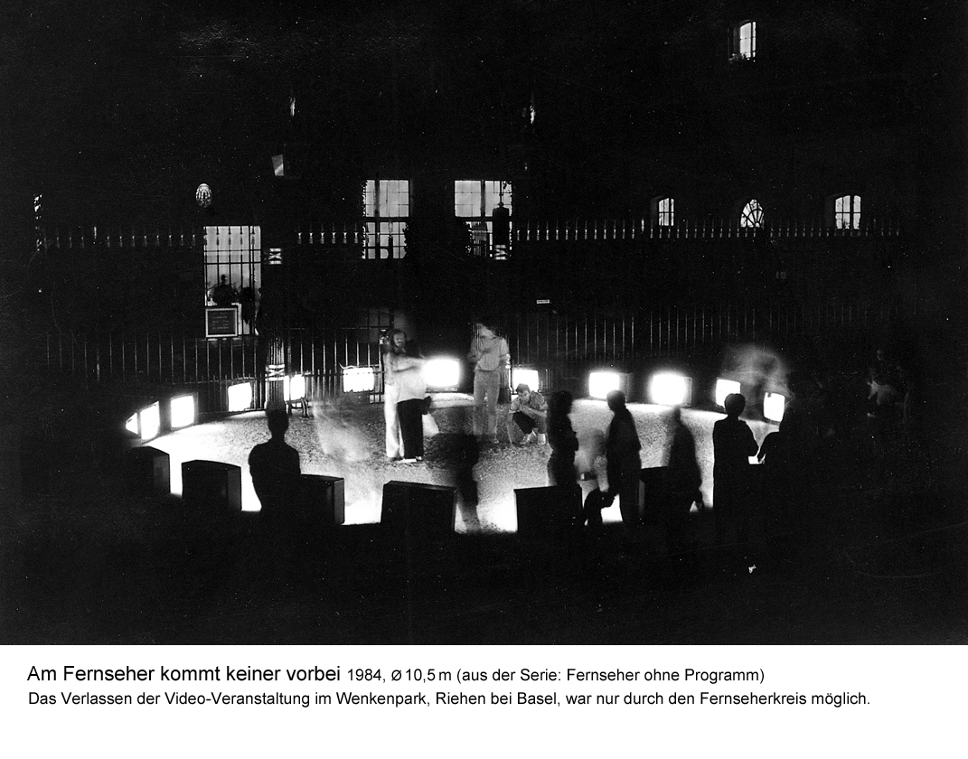 ''Am Fernseher kommt keiner vorbei'' 1984, Fernseherinstallation während der Video-Wochen im Wenkenpark 1984